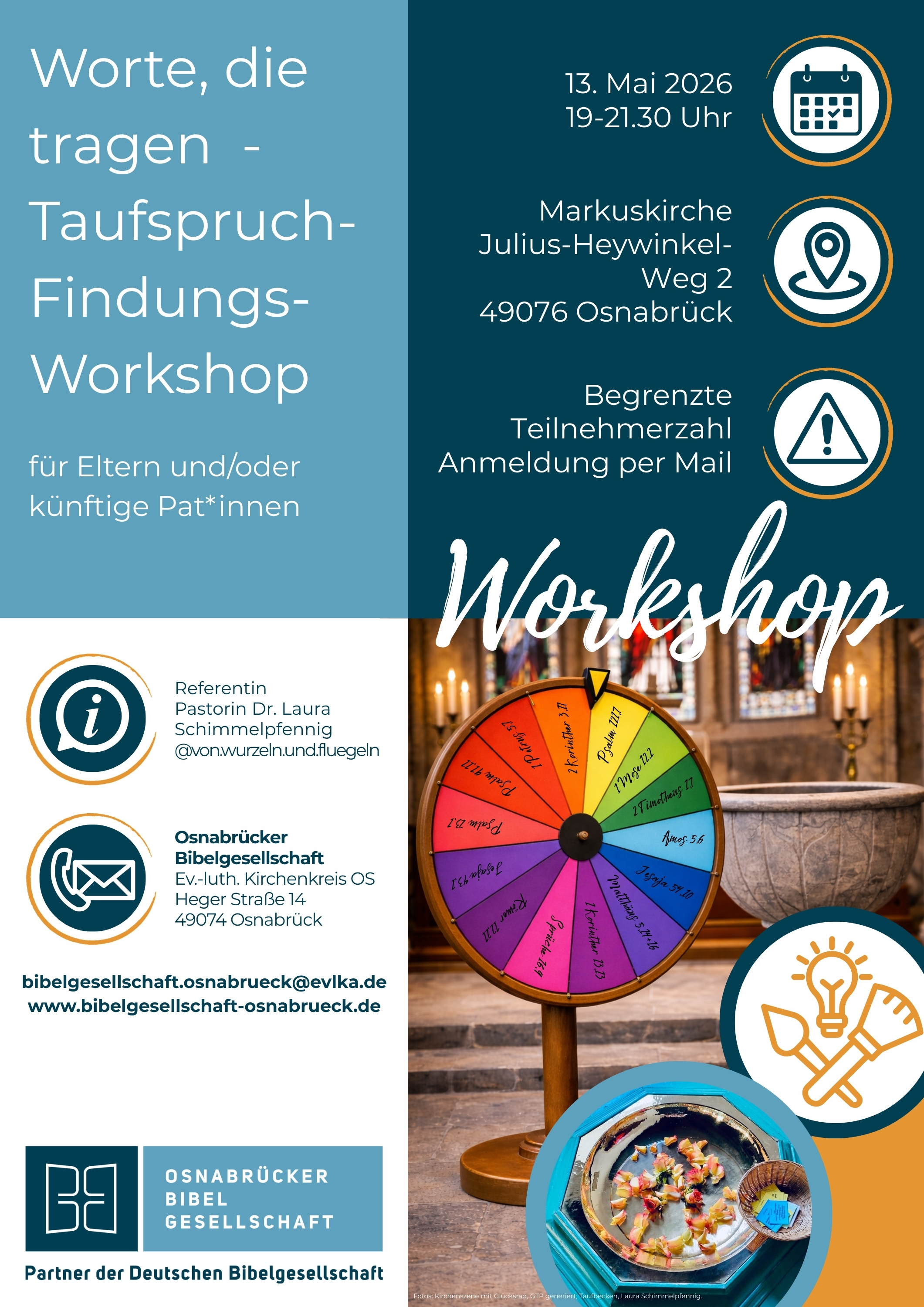 In unserem Workshop „Worte, die tragen“ nehmen wir uns Zeit, gemeinsam auf die Suche nach einem passenden Taufspruch zu gehen. Eltern und künftige Pat:innen sind eingeladen, verschiedene Bibelworte kennenzulernen, ihrer Bedeutung nachzuspüren und darüber ins Gespräch zu kommen, welcher Vers zum Kind, zur Familie und zur gewünschten Botschaft der Taufe passen könnte.